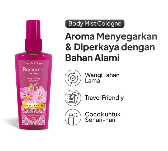 Implora Parfum Bodymist Cologne memberikan kesegaran yang tahan lama dengan wangi yang lembut dan menyegarkan. Mudah disemprotkan dan nyaman digunakan sepanjang hari, bodymist ini memberikan aroma yang menenangkan dan membangkitkan semangat, cocok untuk penggunaan sehari-hari.