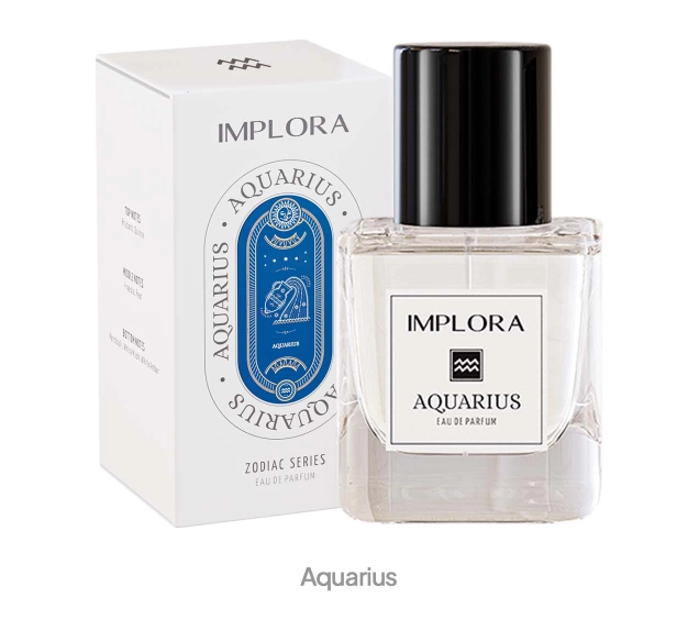 Top : Bergamot, Tangrine, Blackcurrant. Middle : Caramel, Patchouli, Lily Of The Valley, Amber. Bottom : Musk, Vanilla, Raspberry. - AQUARIUS (Woody)