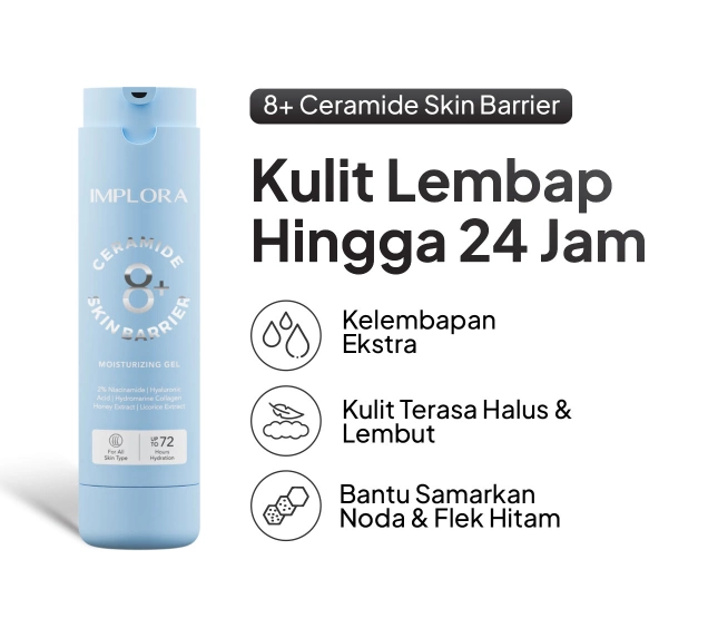 Implora 8+ Ceramide Skin Barrier Moisturizing Gel memberikan kelembapan ekstra pada kulit hingga 72 jam, menjaga kulit tetap terhidrasi sepanjang hari. Diformulasikan dengan 8 jenis ceramide, produk ini memperkuat lapisan pelindung kulit, mencegah kehilangan kelembapan, dan menjaga kulit tetap lembut, halus, dan sehat. Gel ini ringan dan cepat menyerap, cocok untuk semua jenis kulit, terutama kulit yang kering dan dehidrasi, memberikan kelembapan tahan lama tanpa rasa lengket.